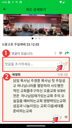 1) 댓글: 피드 상세화면에서 댓글을 등록하실 수 있습니다.
