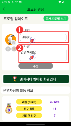 : 다른 사용자가 확인하실 수 있는 간단한 인사말을 수정하실 수 있습니다.