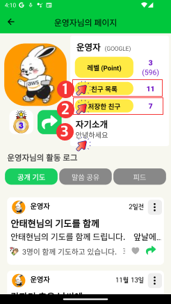 : 터치하시면 프로필 사용자가 친구로 등록한 사용자의 리스트를 확인하실 수 있습니다.